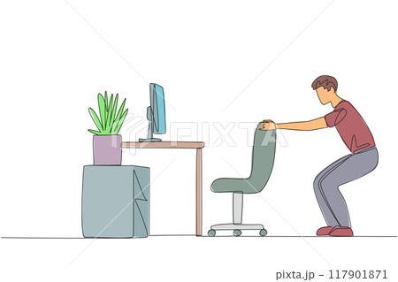 Single continuous line drawing man stands with a slight bend and both hands hold the top of chair. Overtime on weekends. Work and doing light exercise at same time. One line design vector illustration
