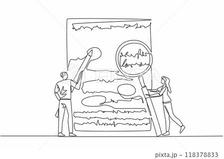 Single one line drawing man standing holding a big pen, woman holding a big magnifying glass. Marking mistakes in paper test. Edit. National Grammar Day. Continuous line design graphic illustration