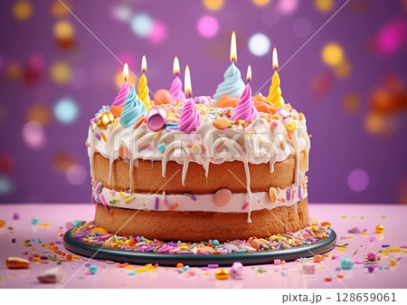 Birthday cake with candles and decorations on party table with bokeh.Macro.AI Generative.