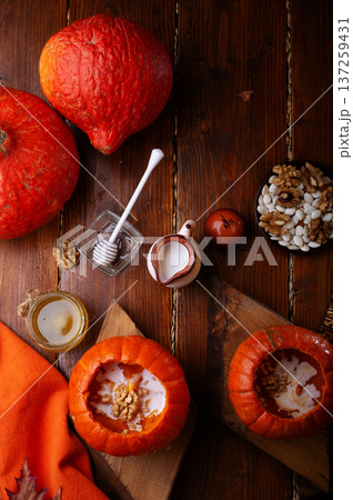 baked pumpkin cream coup with cream and nuts served in pumpkins. served at wooden rural brown table for 2 person . cooking recipe. healthy life concept. flat lay
