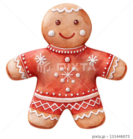 Cute gingerbread man wearing red and green knit hat waves cheerfully on bright red background, perfect for minimalist Christmas decor