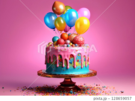 Colorful birthday cake with candies and balloons on cake stand and pink background.AI Generative.