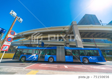 日本の横浜都市景観 横浜駅前(東口)を走る国産初の連節バス・ベイサイドブルーなどを望む