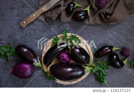 Fresh mini eggplant in a wooden plate on a white wooden background. Vegetables.