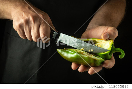 Chef peeling green bell pepper with knife. Close-up of sliced pepper in cook hands. Concept of cooking vegetable dish for breakfast