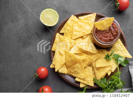 Nachos or tortilla with spicy tomato sauce on a plate with fresh vegetables and herbs