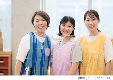 保育園や学童の保育士や先生のイメージ 若い先生とベテラン先生のカメラ目線複数