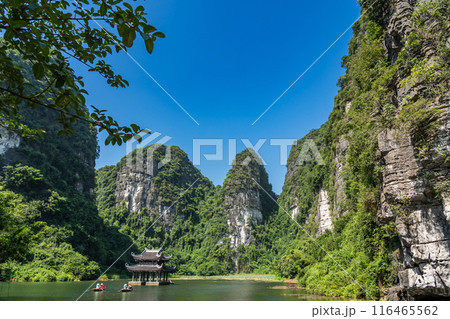 ベトナムハノイ 渓谷の川を手漕ぎのボートで進むニンビンのボートツアーで立ち寄る寺院