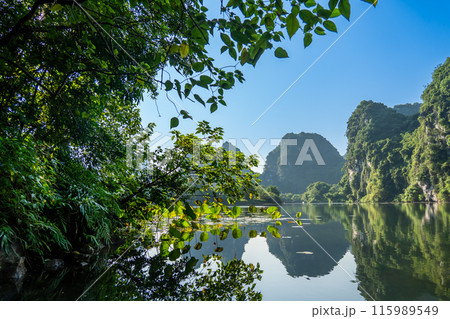 ベトナムハノイ 渓谷の川を手漕ぎのボートで進むニンビンのボートツアーで眺める朝の水上のハス