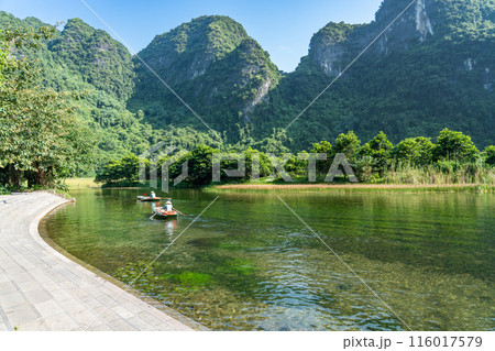 ベトナムハノイ 渓谷の川を手漕ぎのボートで進むニンビンのボートツアーの観光客