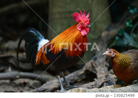 東南アジアの熱帯雨林で見られる美しいニワトリのような野鳥、セキショクヤケイ