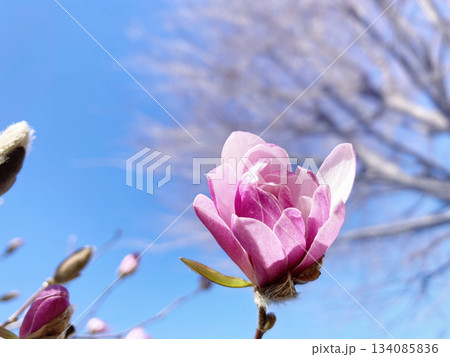 春空に映える満開の紅辛夷(ベニコブシ)別名 姫四手辛夷(ヒメシデコブシ)