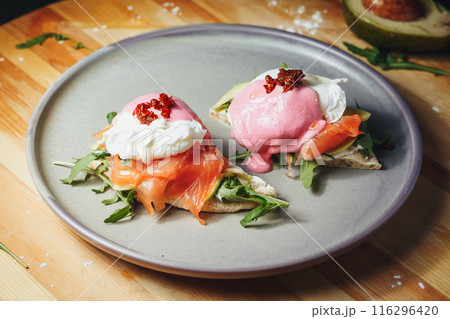 Eggs Benedict with salad leafs, salmon and fresh cherry tomato