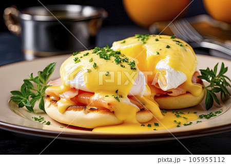 A delicious eggs benedict with smoked salmon, hollandaise sauce on wooden table