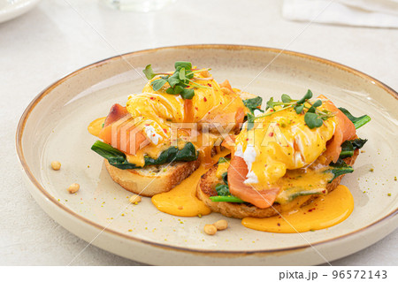 Eggs benedict with spinach, salmon and hollandaise sauce