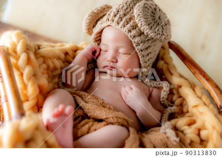 かごの中ですやすや眠る生まれたての赤ちゃん(ニューボーンフォト)