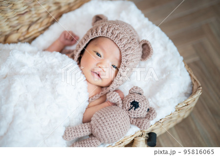 くまさんのぬいぐるみと一緒に寝てほほ笑む生まれたての赤ちゃん(ニューボーンフォト)