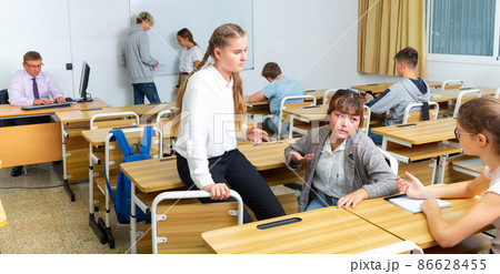 Girl and boy are sitting at the desk and talking about life in classroom.
