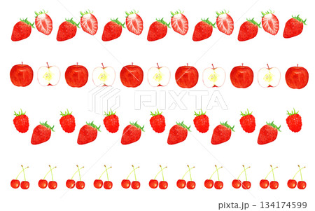 手描き水彩の赤系フルーツ装飾ラインセット(いちご・りんご・ラズベリー・さくらんぼ)