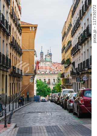 マドリード 石畳の町並みとアルムデナ大聖堂のベルタワー