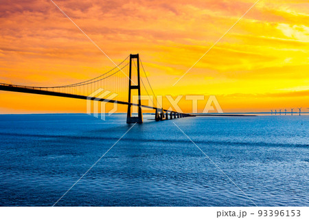 Great Belt Suspension Bridge at Sunset, Denmark.