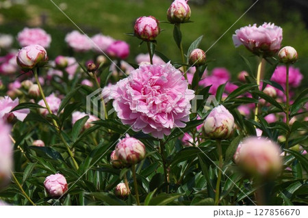 芍薬園にピンク色のシャクヤク(サラ・ベルナール)がたくさんのつぼみの中に咲いています。