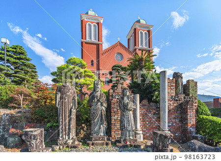 [九州・長崎] 赤レンガのカトリック浦上教会の前に立つ被爆遺構。
