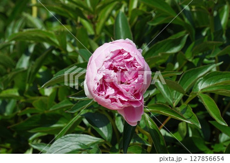 芍薬園にピンク色のシャクヤクが咲いています。