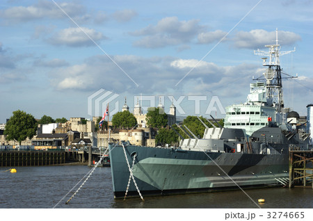 ロンドン:テムズ川のベルファースト号とタワーブリッジ
