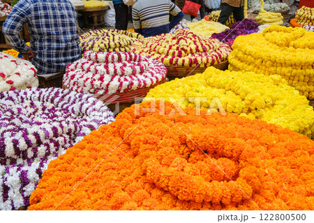 インドベンガルール_KRマーケットでガーランド(花輪)を売る商人