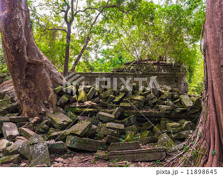 【カンボジア】苔がついたベン・メリア遺跡の瓦礫(シェムリアップ)