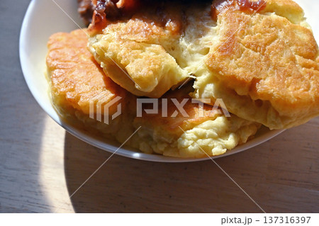 オレンジ色のマンゴーの甘い菓子パン 木の皿に盛られた焼きたてスイーツの食卓