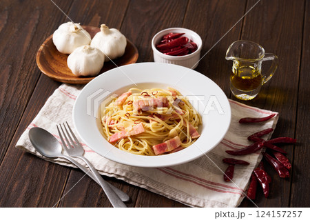ベーコンとウインナーのペペロンチーノ スパゲティ