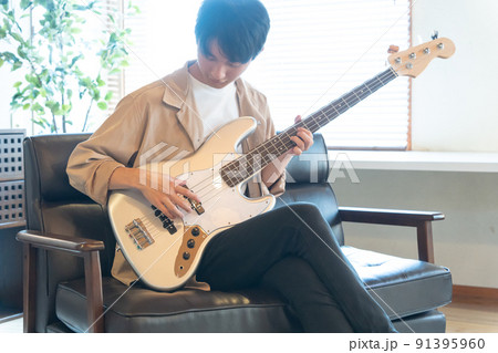 楽器のベースの演奏をする、若い男性ミュージシャン