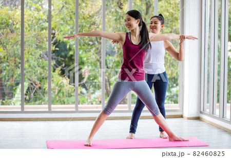 Young lady practice yoga by left hand point up right hand touching leg and face up to sky. Personal trainer stand at her back to support and help to make right position.