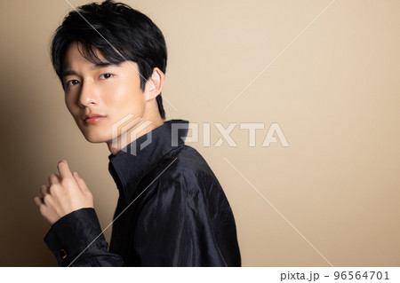 A beautiful young Asian woman with clean, fresh skin against a beige background. Skincare, facial treatment, cosmetology, beauty, and spa. An elegant portrait of an Asian woman.