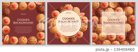 A set of colorful backgrounds with delicious cookies. The concept of confectionery, baking, cooking. Vector illustration for the design of posters, flyers, postcards, invitations