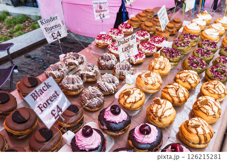 Variety of Delicious Cupcakes with Frosting and Toppings in Outdoor Market Setting