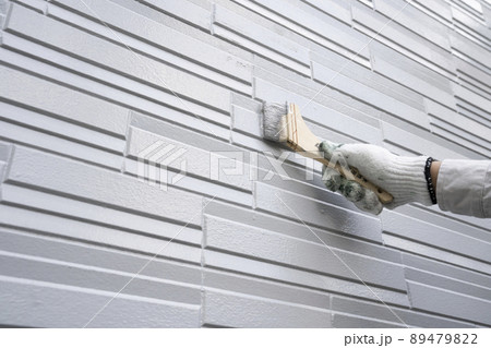 刷毛で戸建て住宅の外壁を塗る塗装職人の手元