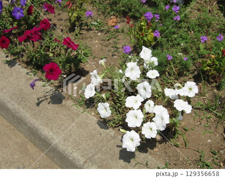 ペチニアの白赤桃色青色の花と紫色のバーベナの花