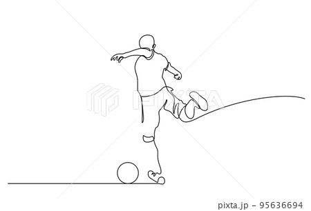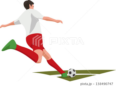 サッカーの試合中にシュートをするフットボール選手とサッカーボール