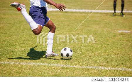 Feet, soccer player and penalty kick on field for goal, competition or game for sports career. Man, football and shooting ball on grass pitch with accuracy for training, workout and contest outdoor
