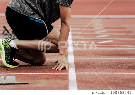陸上競技のトラックでスタートラインに立つ男性ランナー