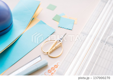 Craft workspace with paper cutter, scissors and colorful paper pieces on pastel background, DIY scrapbooking flat lay