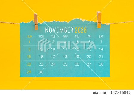 November 2026 calendar tearing hanged with brown rope on yellow color background.
