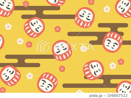 横長の背景素材:日本の伝統的な柄とだるまと梅