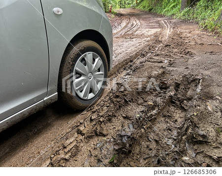 ぬかるみでスタックした乗用車の前輪タイヤの素材写真