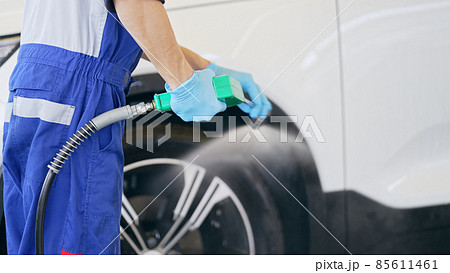 Man spraying pressure washer for car wash in car care shop. Focus on car