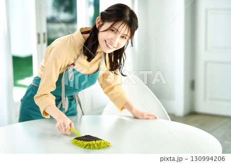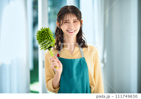 掃除をするエプロン姿の主婦
