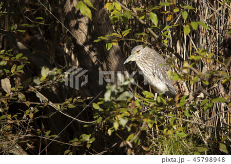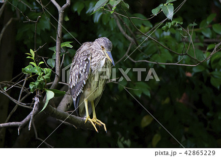 池のほとりの茂みにひそむゴイサギの幼鳥(ホシゴイ)
